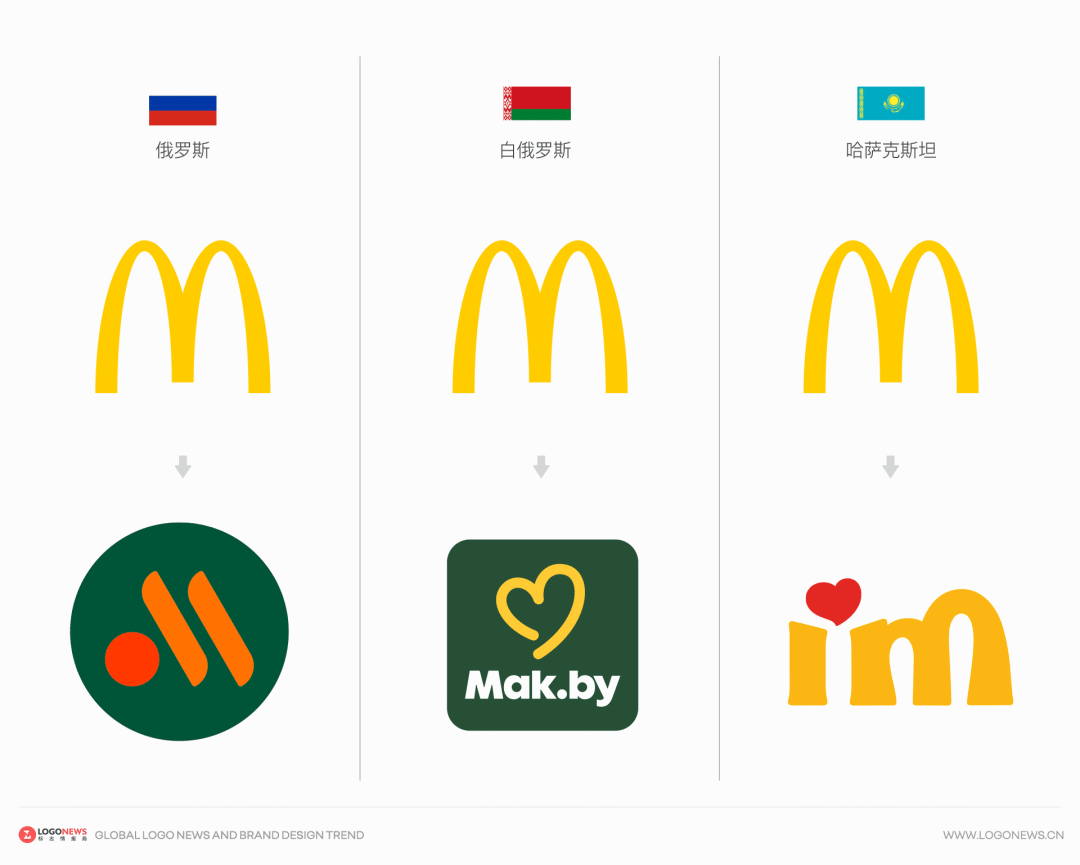 继俄罗斯和白俄罗斯麦当劳改名换姓后,哈萨克斯坦的麦当劳也抛弃了原有的品牌名称和标志,将名字更改为「Im」并于近日发布了全新的品牌LOGO。其产品包装、员工制服和公司品牌的其他元素今后将全面采用新的企业形象识别。