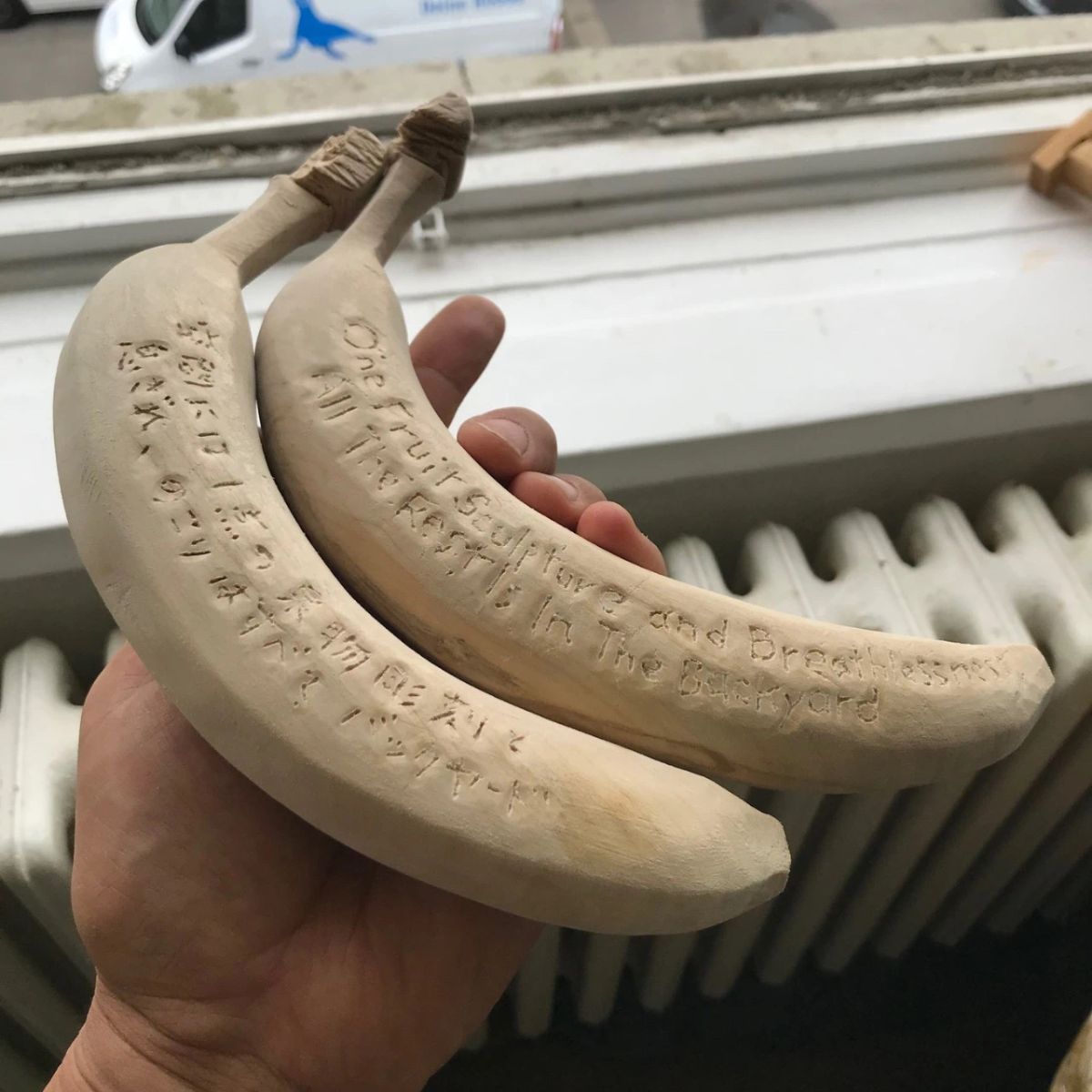 他的木雕香蕉,从弯曲的弧度到表皮的斑点,